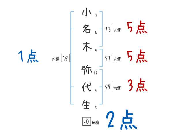 地運![]() | 小名木弥代生さんの地運は27画の3つ星!頭脳明晰だが強情で摩擦が多い傾向。孤立に注意。 個性を表す基礎的な運勢です。性格形成や対人関係、行動力など家庭環境に影響されます。主に誕生してから20歳くらいまでの若年期の運勢を表します。 |