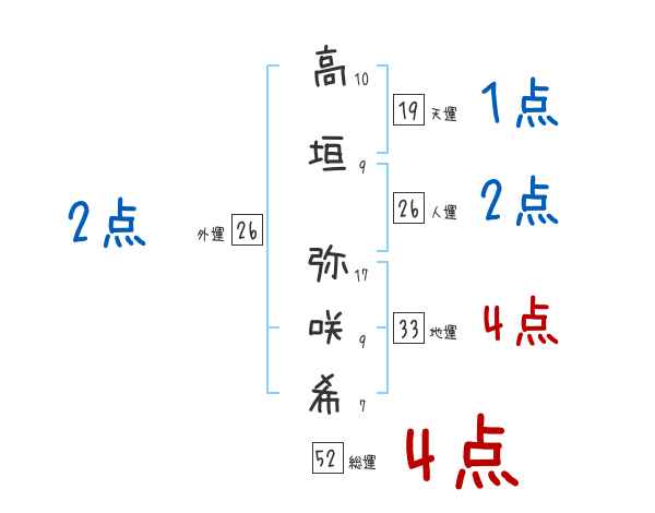 外運![]() | 高垣弥咲希さんの外運は26画の2つ星!波瀾万丈かも。信頼できる人を大事にしましょう。 生活面を象徴する運勢です。外部から受ける影響力を表し、結婚運、家庭運や職場、環境への順応性を表します。 |
