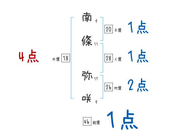 総運![]() | 南條弥咲さんの総運は46画の1つ星!迷走することが多く苦労するかも。目先のことにとらわれないように。 あなたの人生を表す1番重要な運勢です。生涯を通じて影響する総合運となり、主に50歳以降の晩年期に影響を及ぼします。 |