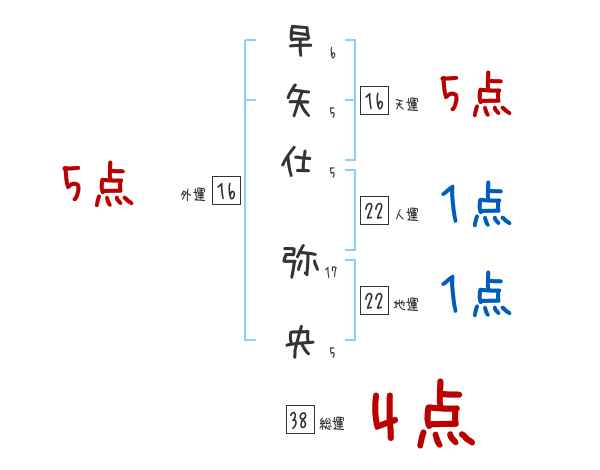 天運![]() | 早矢仕弥央さんの天運は16画の5つ星!人望が厚く大きく発展する。逆転成功が見える。 家系が持つ宿命的な運勢を表します。祖先から受け継いだ苗字ですので自分の力が及びません。家柄を象徴します。 |
