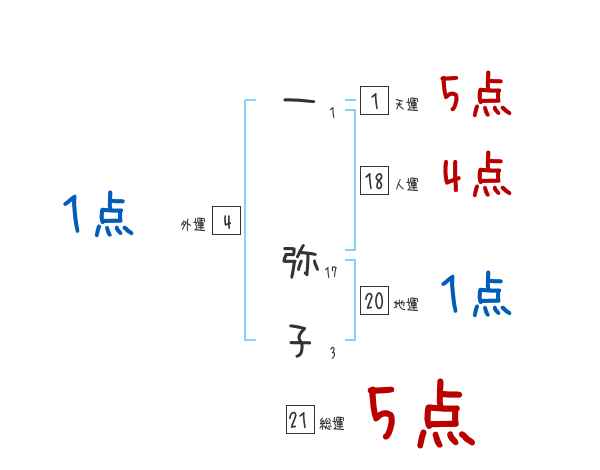 天運![]() | 一弥子さんの天運は1画の5つ星!行動力、指導力があり出世し繁栄する。幸運に恵まれる。 家系が持つ宿命的な運勢を表します。祖先から受け継いだ苗字ですので自分の力が及びません。家柄を象徴します。 |