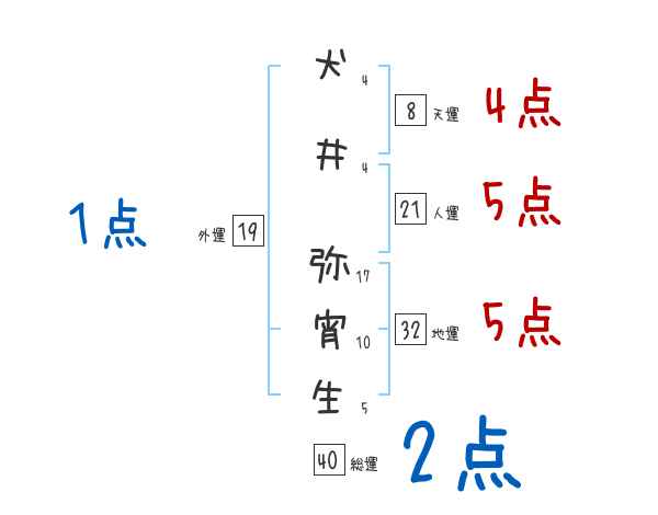 天運![]() | 犬井弥宵生さんの天運は8画の4つ星!勤勉家。根気強く努力し成功する。忍耐力がある。 家系が持つ宿命的な運勢を表します。祖先から受け継いだ苗字ですので自分の力が及びません。家柄を象徴します。 |