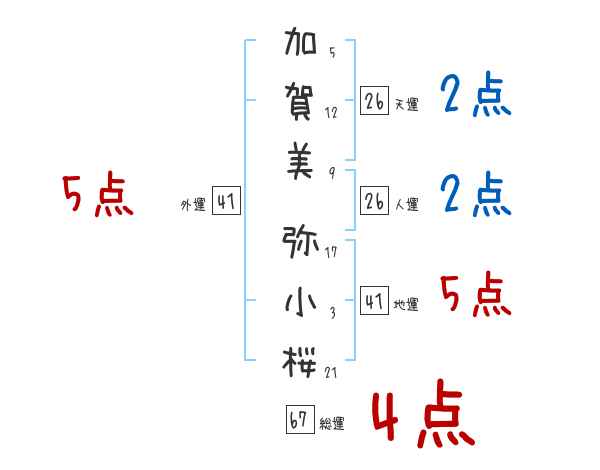 天運![]() | 加賀美弥小桜さんの天運は26画の2つ星!波瀾万丈かも。信頼できる人を大事にしましょう。 家系が持つ宿命的な運勢を表します。祖先から受け継いだ苗字ですので自分の力が及びません。家柄を象徴します。 |