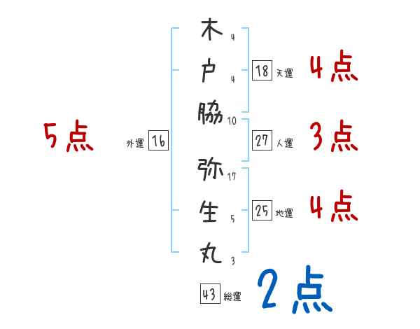 総運![]() | 木戸脇弥生丸さんの総運は43画の2つ星!頑固な性格で独立心が強いかも。やや非現実的で浪費に注意しましょう。 あなたの人生を表す1番重要な運勢です。生涯を通じて影響する総合運となり、主に50歳以降の晩年期に影響を及ぼします。 |