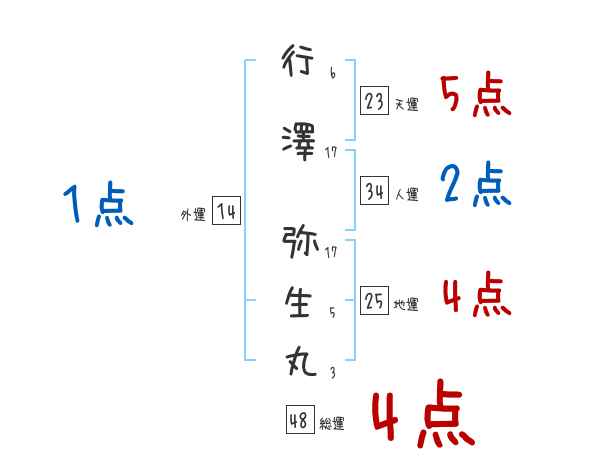 天運![]() | 行澤弥生丸さんの天運は23画の5つ星!想像力に優れ活力がある。一代で成功し名誉を手に入れる。 家系が持つ宿命的な運勢を表します。祖先から受け継いだ苗字ですので自分の力が及びません。家柄を象徴します。 |