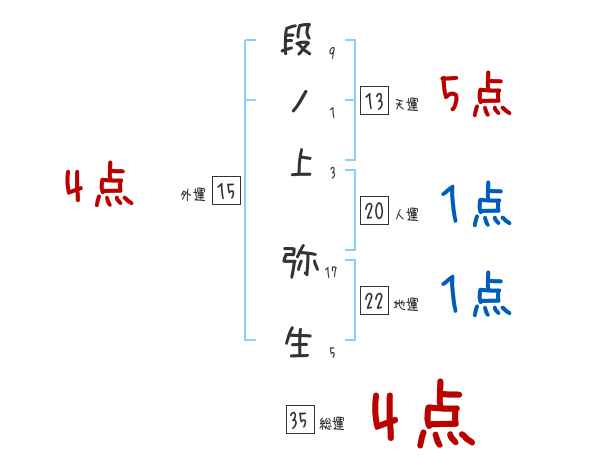 外運![]() | 段ノ上弥生さんの外運は15画の4つ星!人徳があり出世する。順調に物事を進め円満な人生。 生活面を象徴する運勢です。外部から受ける影響力を表し、結婚運、家庭運や職場、環境への順応性を表します。 |