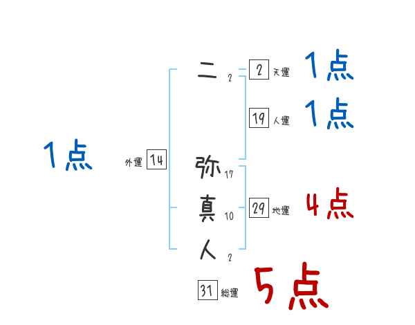 外運![]() | 二弥真人さんの外運は14画の1つ星!人に対して優しいがストレスを溜め込みがち。人間関係のトラブルを避けるよう気をつけましょう。 生活面を象徴する運勢です。外部から受ける影響力を表し、結婚運、家庭運や職場、環境への順応性を表します。 |