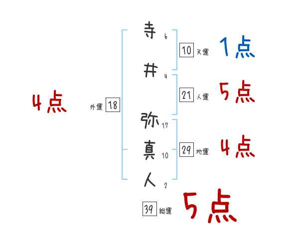 人運![]() | 寺井弥真人さんの人運は21画の5つ星!統率力がある。独立し成功する。名誉を手に入れる。 性格や才能などを表す2番目に重要な運勢です。人間関係や協調性、社会的な成功に影響します。主に20歳から50歳ぐらいまでの中年期の運勢を表します。 |