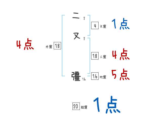 天運![]() | 二又彊さんの天運は4画の1つ星!感情が不安定で苦労するかも。周囲との協調を心掛けましょう。 家系が持つ宿命的な運勢を表します。祖先から受け継いだ苗字ですので自分の力が及びません。家柄を象徴します。 |