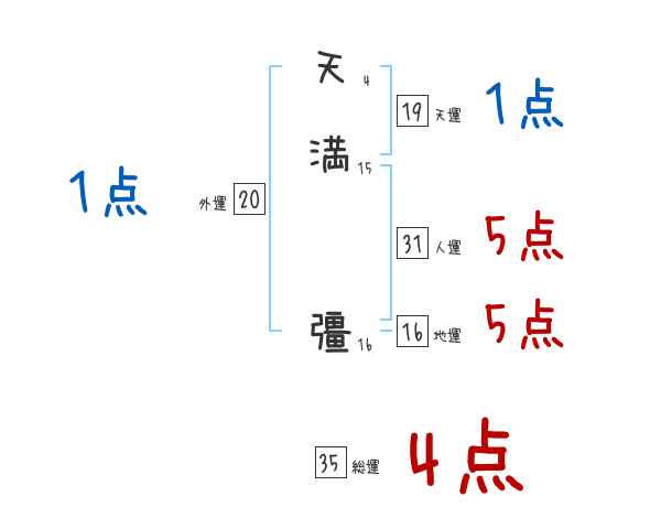 天運![]() | 天満彊さんの天運は19画の1つ星!優れた才能を持ちますが、協調性が足りないことも。周りの人と協力する事を意識しましょう。 家系が持つ宿命的な運勢を表します。祖先から受け継いだ苗字ですので自分の力が及びません。家柄を象徴します。 |