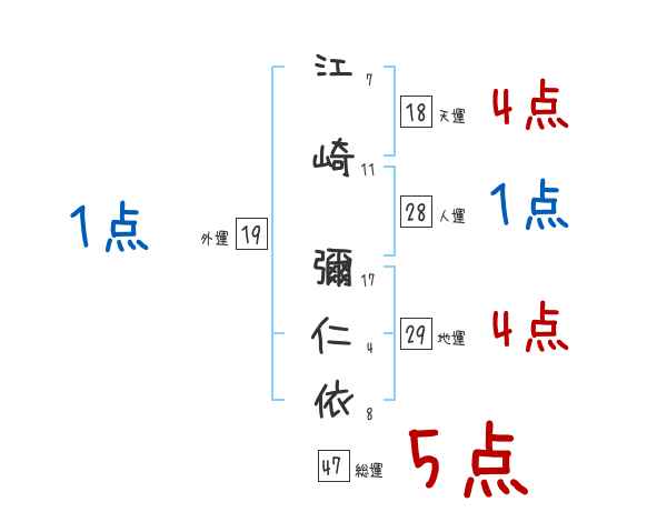 総運![]() | 江崎彌仁依さんの総運は47画の5つ星!実力が開花し発展する円満な人生。財に恵まれる。 あなたの人生を表す1番重要な運勢です。生涯を通じて影響する総合運となり、主に50歳以降の晩年期に影響を及ぼします。 |