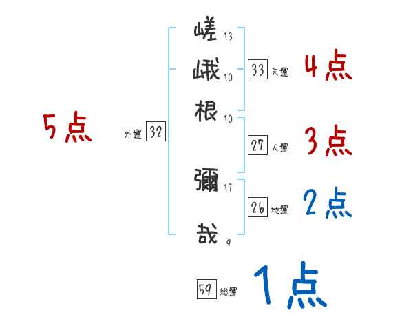 外運![]() | 嵯峨根彌哉さんの外運は32画の5つ星!柔軟性があり成功する。チャンスが多く金運が良い。 生活面を象徴する運勢です。外部から受ける影響力を表し、結婚運、家庭運や職場、環境への順応性を表します。 |