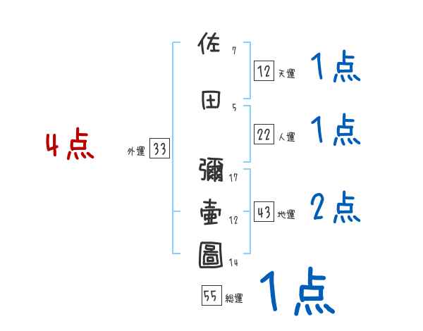 天運![]()  | 佐田彌壷圖さんの天運は12画の1つ星!簡単な失敗で諦めてしまいやすいかも。着実に行動すると良いでしょう。 家系が持つ宿命的な運勢を表します。祖先から受け継いだ苗字ですので自分の力が及びません。家柄を象徴します。 |