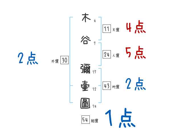 天運![]() | 木谷彌壷圖さんの天運は11画の4つ星!着実に富や地位を得る幸運な人生。 家系が持つ宿命的な運勢を表します。祖先から受け継いだ苗字ですので自分の力が及びません。家柄を象徴します。 |