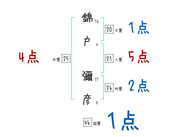 人運![]() | 錦戸彌彦さんの人運は21画の5つ星!統率力がある。独立し成功する。名誉を手に入れる。 性格や才能などを表す2番目に重要な運勢です。人間関係や協調性、社会的な成功に影響します。主に20歳から50歳ぐらいまでの中年期の運勢を表します。 |