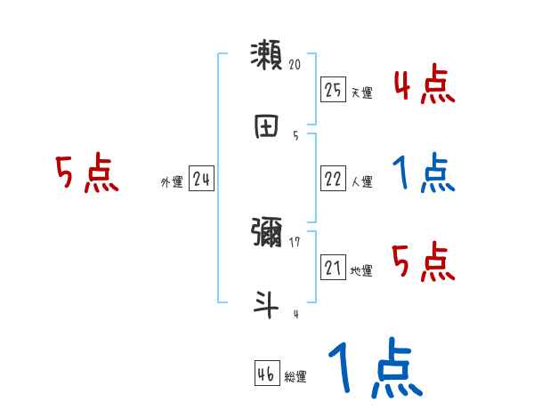 天運![]() | 瀬田彌斗さんの天運は25画の4つ星!個性があり才能があふれる。強運の持ち主で発展する。 家系が持つ宿命的な運勢を表します。祖先から受け継いだ苗字ですので自分の力が及びません。家柄を象徴します。 |