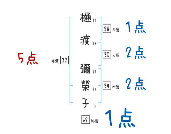 外運![]() | 樋渡彌榮子さんの外運は32画の5つ星!柔軟性があり成功する。チャンスが多く金運が良い。 生活面を象徴する運勢です。外部から受ける影響力を表し、結婚運、家庭運や職場、環境への順応性を表します。 |