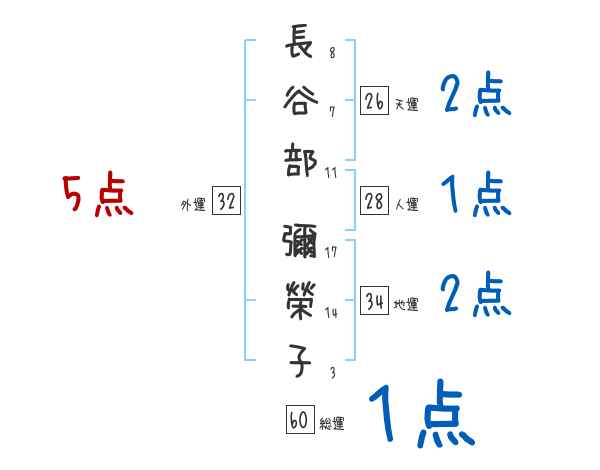 外運![]() | 長谷部彌榮子さんの外運は32画の5つ星!柔軟性があり成功する。チャンスが多く金運が良い。 生活面を象徴する運勢です。外部から受ける影響力を表し、結婚運、家庭運や職場、環境への順応性を表します。 |