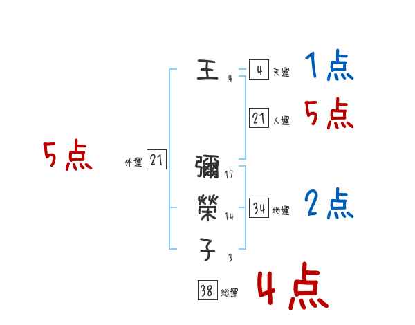 | 人運  | 王彌榮子さんの人運は21画の5つ星!統率力がある。独立し成功する。名誉を手に入れる。性格や才能などを表す2番目に重要な運勢です。人間関係や協調性、社会的な成功に影響します。主に20歳から50歳ぐらいまでの中年期の運勢を表します。 |