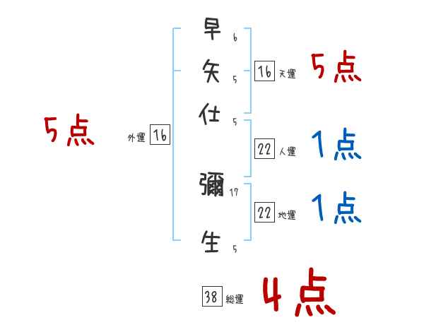外運![]() | 早矢仕彌生さんの外運は16画の5つ星!人望が厚く大きく発展する。逆転成功が見える。 生活面を象徴する運勢です。外部から受ける影響力を表し、結婚運、家庭運や職場、環境への順応性を表します。 |