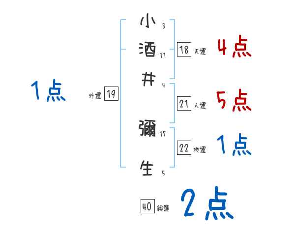 人運![]() | 小酒井彌生さんの人運は21画の5つ星!統率力がある。独立し成功する。名誉を手に入れる。 性格や才能などを表す2番目に重要な運勢です。人間関係や協調性、社会的な成功に影響します。主に20歳から50歳ぐらいまでの中年期の運勢を表します。 |