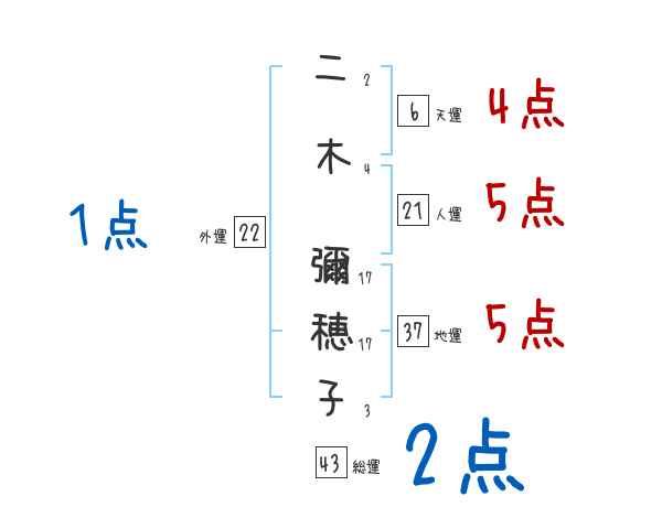 天運![]() | 二木彌穂子さんの天運は6画の4つ星!慎重な努力家で信頼を得る。誠実な精神で向上心に優れる。 家系が持つ宿命的な運勢を表します。祖先から受け継いだ苗字ですので自分の力が及びません。家柄を象徴します。 |