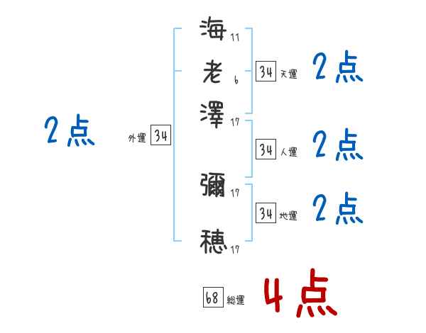 総運![]() | 海老澤彌穂さんの総運は68画の4つ星!潜在能力が高く集中力が高い。勤勉に励み発展する。 あなたの人生を表す1番重要な運勢です。生涯を通じて影響する総合運となり、主に50歳以降の晩年期に影響を及ぼします。 |