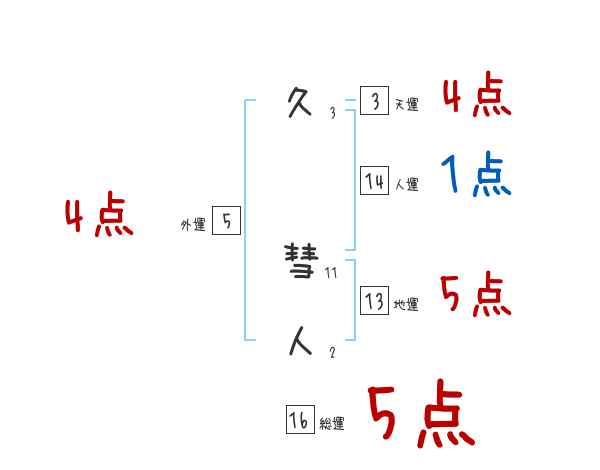 天運![]() | 久彗人さんの天運は3画の4つ星!活動的で才能に恵まれ、多くの信頼を得る。希望に満ち成長する。 家系が持つ宿命的な運勢を表します。祖先から受け継いだ苗字ですので自分の力が及びません。家柄を象徴します。 |