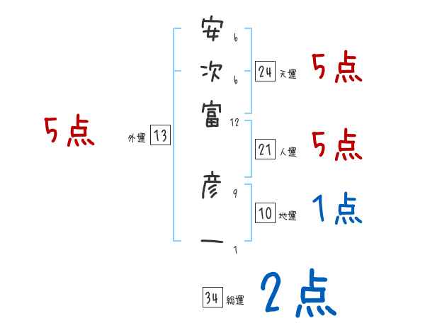 天運![]() | 安次富彦一さんの天運は24画の5つ星!家庭運が良く順調な人生。金運にも恵まれる。 家系が持つ宿命的な運勢を表します。祖先から受け継いだ苗字ですので自分の力が及びません。家柄を象徴します。 |