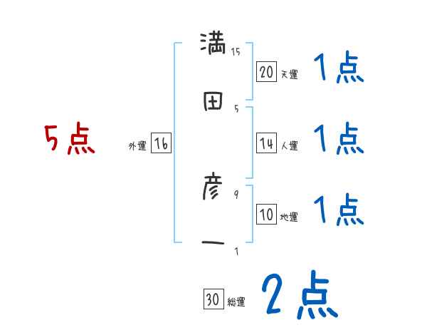 外運![]() | 満田彦一さんの外運は16画の5つ星!人望が厚く大きく発展する。逆転成功が見える。 生活面を象徴する運勢です。外部から受ける影響力を表し、結婚運、家庭運や職場、環境への順応性を表します。 |