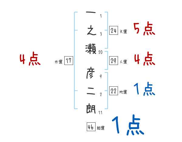 外運![]() | 一之瀬彦二朗さんの外運は17画の4つ星!積極的な行動力。地位を気づき財産を手に入れる。純粋な心と直感力。 生活面を象徴する運勢です。外部から受ける影響力を表し、結婚運、家庭運や職場、環境への順応性を表します。 |