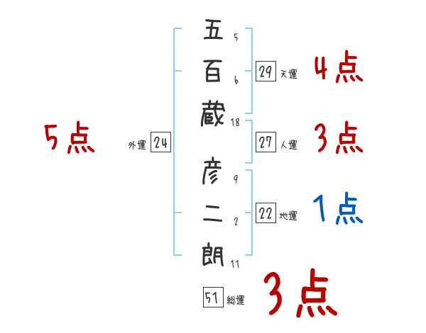 総運![]() | 五百蔵彦二朗さんの総運は51画の3つ星!変化が激しく、危険に注意。堅実な性格。 あなたの人生を表す1番重要な運勢です。生涯を通じて影響する総合運となり、主に50歳以降の晩年期に影響を及ぼします。 |