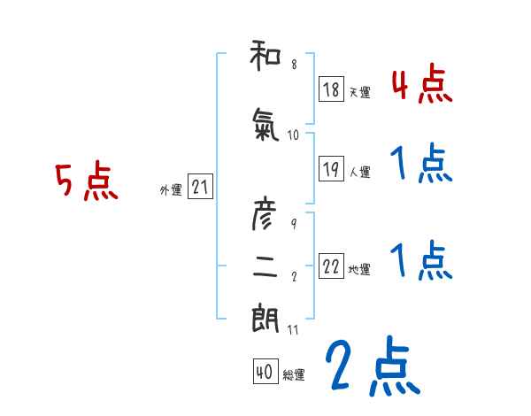 地運![]() | 和氣彦二朗さんの地運は22画の1つ星!努力することが苦手ないっぽう手先が器用。芸術性にも優れる。 個性を表す基礎的な運勢です。性格形成や対人関係、行動力など家庭環境に影響されます。主に誕生してから20歳くらいまでの若年期の運勢を表します。 |