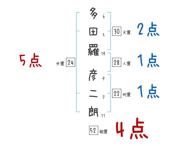天運![]() | 多田羅彦二朗さんの天運は30画の2つ星!浮き沈みの激しさに注意しましょう。 家系が持つ宿命的な運勢を表します。祖先から受け継いだ苗字ですので自分の力が及びません。家柄を象徴します。 |