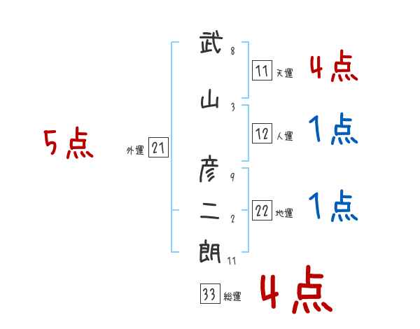 天運![]() | 武山彦二朗さんの天運は11画の4つ星!着実に富や地位を得る幸運な人生。 家系が持つ宿命的な運勢を表します。祖先から受け継いだ苗字ですので自分の力が及びません。家柄を象徴します。 |