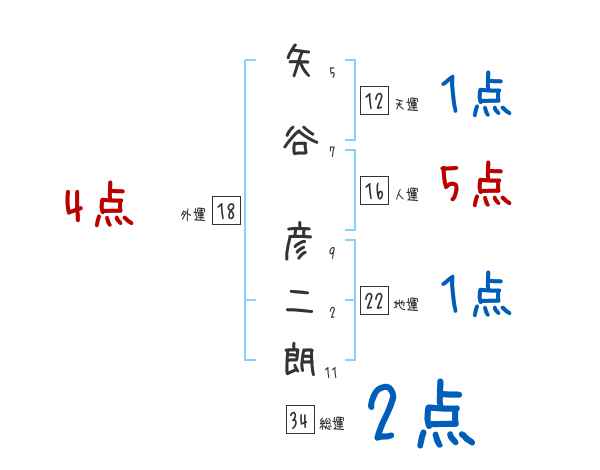 総運![]() | 矢谷彦二朗さんの総運は34画の2つ星!独創性に優れるが、自尊心が強く災難に注意しましょう。 あなたの人生を表す1番重要な運勢です。生涯を通じて影響する総合運となり、主に50歳以降の晩年期に影響を及ぼします。 |