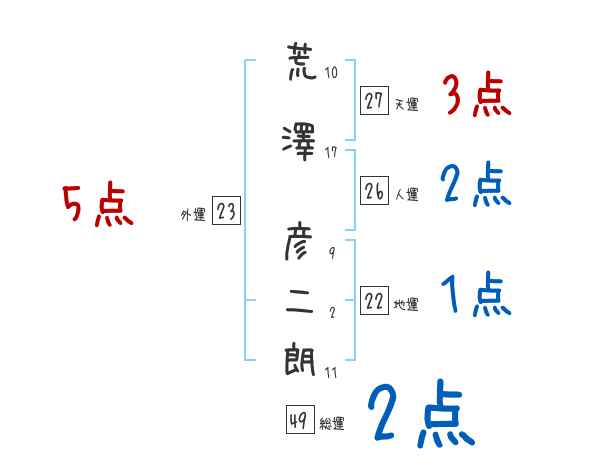 天運![]() | 荒澤彦二朗さんの天運は27画の3つ星!頭脳明晰だが強情で摩擦が多い傾向。孤立に注意。 家系が持つ宿命的な運勢を表します。祖先から受け継いだ苗字ですので自分の力が及びません。家柄を象徴します。 |