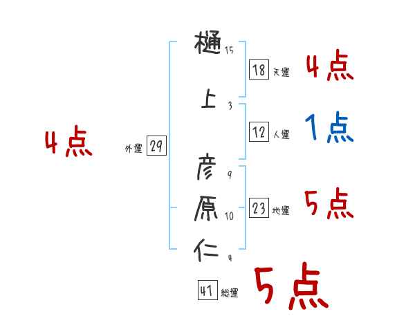 天運![]() | 樋上彦原仁さんの天運は18画の4つ星!情熱的で剛気。忍耐力があり信頼される。 家系が持つ宿命的な運勢を表します。祖先から受け継いだ苗字ですので自分の力が及びません。家柄を象徴します。 |