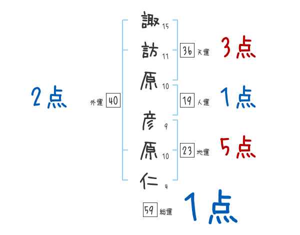 天運![]() | 諏訪原彦原仁さんの天運は36画の3つ星!先見性が豊かです。多少神経質で苦労することも。 家系が持つ宿命的な運勢を表します。祖先から受け継いだ苗字ですので自分の力が及びません。家柄を象徴します。 |