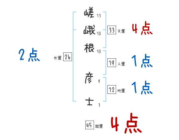 天運![]() | 嵯峨根彦士さんの天運は33画の4つ星!権力志向でプライドが高い。勇気があり運を切り開き成功する。 家系が持つ宿命的な運勢を表します。祖先から受け継いだ苗字ですので自分の力が及びません。家柄を象徴します。 |