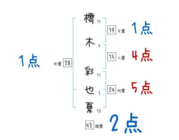 総運![]() | 樗木彩也夏さんの総運は43画の2つ星!頑固な性格で独立心が強いかも。やや非現実的で浪費に注意しましょう。 あなたの人生を表す1番重要な運勢です。生涯を通じて影響する総合運となり、主に50歳以降の晩年期に影響を及ぼします。 |