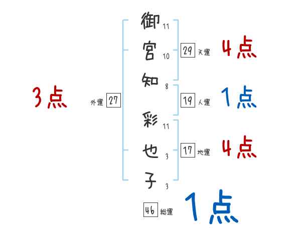 総運![]() | 御宮知彩也子さんの総運は46画の1つ星!迷走することが多く苦労するかも。目先のことにとらわれないように。 あなたの人生を表す1番重要な運勢です。生涯を通じて影響する総合運となり、主に50歳以降の晩年期に影響を及ぼします。 |