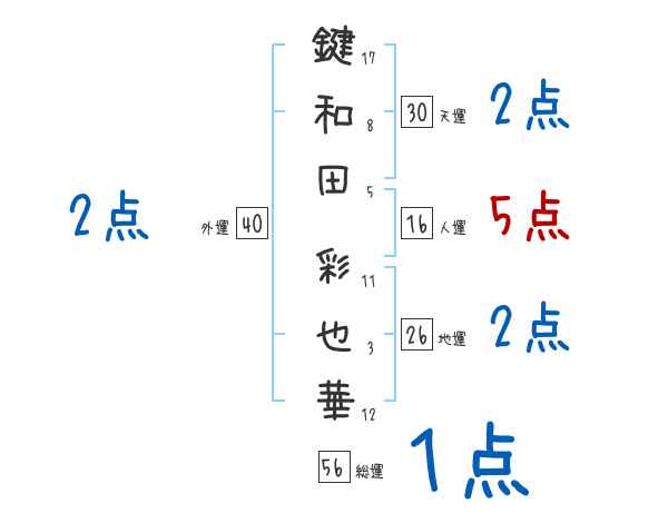 人運![]() | 鍵和田彩也華さんの人運は16画の5つ星!人望が厚く大きく発展する。逆転成功が見える。 性格や才能などを表す2番目に重要な運勢です。人間関係や協調性、社会的な成功に影響します。主に20歳から50歳ぐらいまでの中年期の運勢を表します。 |
