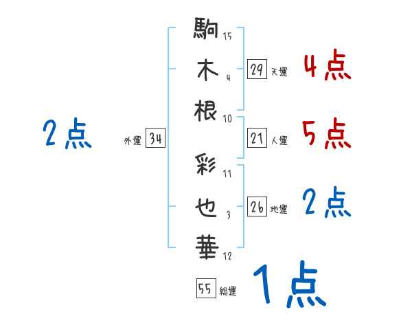 人運![]() | 駒木根彩也華さんの人運は21画の5つ星!統率力がある。独立し成功する。名誉を手に入れる。 性格や才能などを表す2番目に重要な運勢です。人間関係や協調性、社会的な成功に影響します。主に20歳から50歳ぐらいまでの中年期の運勢を表します。 |