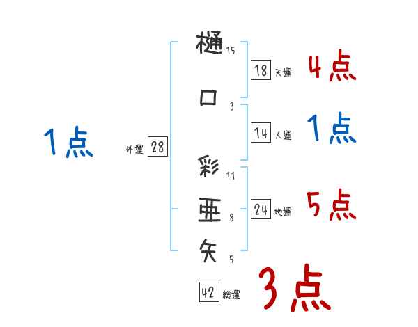 天運![]() | 樋口彩亜矢さんの天運は18画の4つ星!情熱的で剛気。忍耐力があり信頼される。 家系が持つ宿命的な運勢を表します。祖先から受け継いだ苗字ですので自分の力が及びません。家柄を象徴します。 |