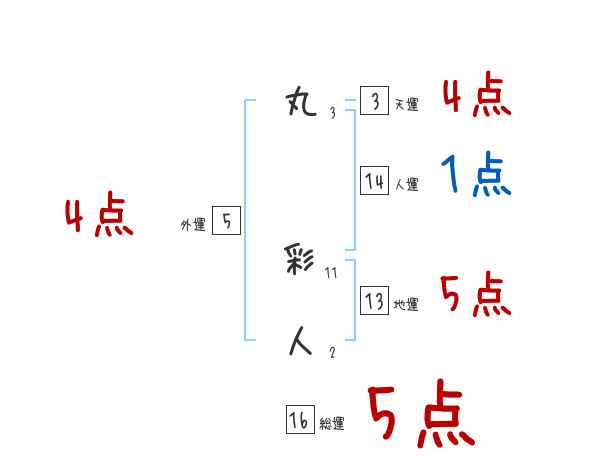 天運![]() | 丸彩人さんの天運は3画の4つ星!活動的で才能に恵まれ、多くの信頼を得る。希望に満ち成長する。 家系が持つ宿命的な運勢を表します。祖先から受け継いだ苗字ですので自分の力が及びません。家柄を象徴します。 |