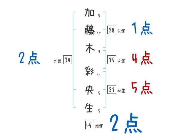 天運![]() | 加藤木彩央生さんの天運は28画の1つ星!家庭環境に注意。スポーツで活躍できる能力があるかも。 家系が持つ宿命的な運勢を表します。祖先から受け継いだ苗字ですので自分の力が及びません。家柄を象徴します。 |