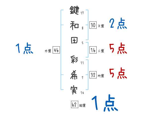 人運![]() | 鍵和田彩希実さんの人運は16画の5つ星!人望が厚く大きく発展する。逆転成功が見える。 性格や才能などを表す2番目に重要な運勢です。人間関係や協調性、社会的な成功に影響します。主に20歳から50歳ぐらいまでの中年期の運勢を表します。 |