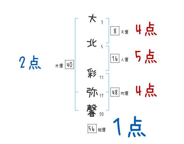 人運![]() | 大北彩弥馨さんの人運は16画の5つ星!人望が厚く大きく発展する。逆転成功が見える。 性格や才能などを表す2番目に重要な運勢です。人間関係や協調性、社会的な成功に影響します。主に20歳から50歳ぐらいまでの中年期の運勢を表します。 |