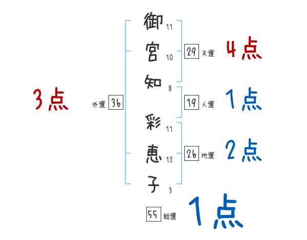 外運![]() | 御宮知彩恵子さんの外運は36画の3つ星!先見性が豊かです。多少神経質で苦労することも。 生活面を象徴する運勢です。外部から受ける影響力を表し、結婚運、家庭運や職場、環境への順応性を表します。 |